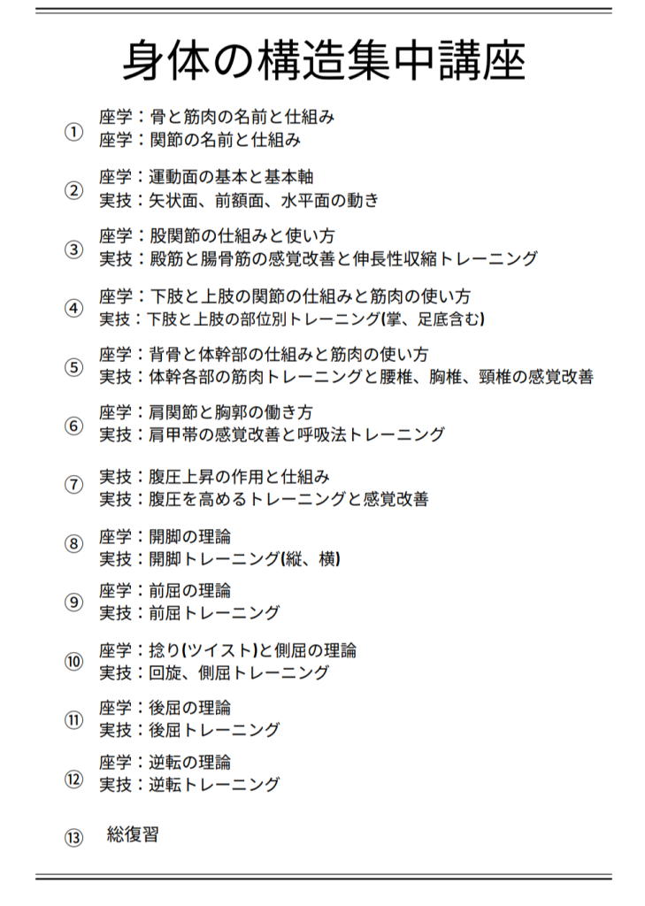 ↑こちらが身体の構造集中講座のカリキュラムとなります。